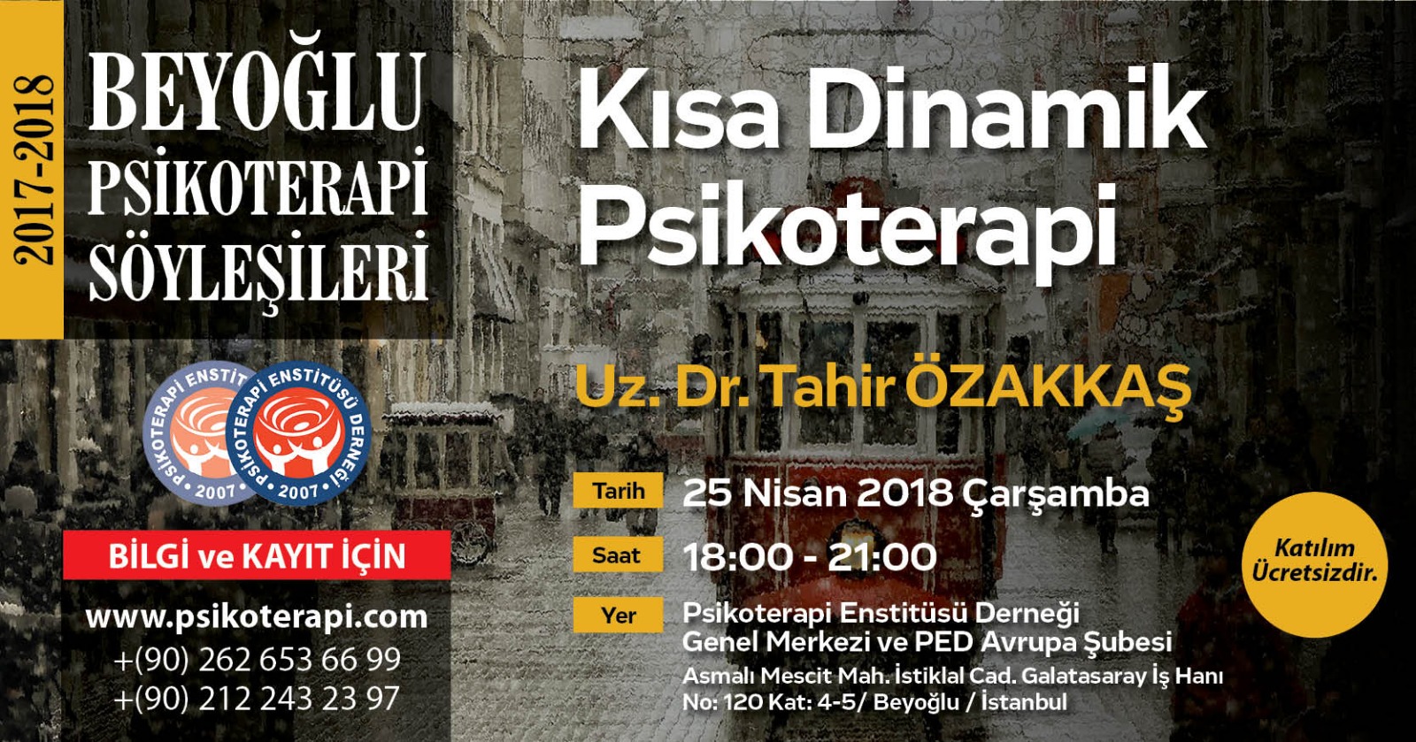 PSİKOTERAPİ ENSTİTÜSÜ DERNEĞİ GENEL MERKEZİ PSİKOTERAPİ SÖYLEŞİLERİ Uz. Dr. Tahir Özakkaş – “Kısa Dinamik Psikoterapi” Beyoğlu 25.04.2018 Saat: 18.00-21.00 **”Rasgele belirleme”sonucunda Söyleşimize katılan 50 kişiye “Alerji ve Deri Hastalıklarında Hipnoterapi” kitabı hediye edilecektir. Hediye edeceğimiz kitabı alabilmeniz için ön kayıt formunu doldurmanız ve söyleşimize katılmanız gerekmektedir. Kayıt için Tıklayınız.. Katılımcı Listesi için…