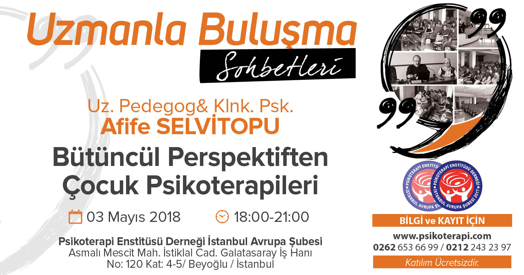 PSİKOTERAPİ ENSTİTÜSÜ DERNEĞİ İSTANBUL AVRUPA ŞUBESİ UZMANLA BULUŞMA SOHBETLERİ Uz. Pedagog & Klnk. Psk. Afife Selvitopu – “Bütüncül Perspektiften Çocuk Psikoterapileri” Beyoğlu 03.05.2018 Saat: 18.00-21.00 Kayıt için Tıklayınız.. Katılımcı Listesi için Tıklayınız..