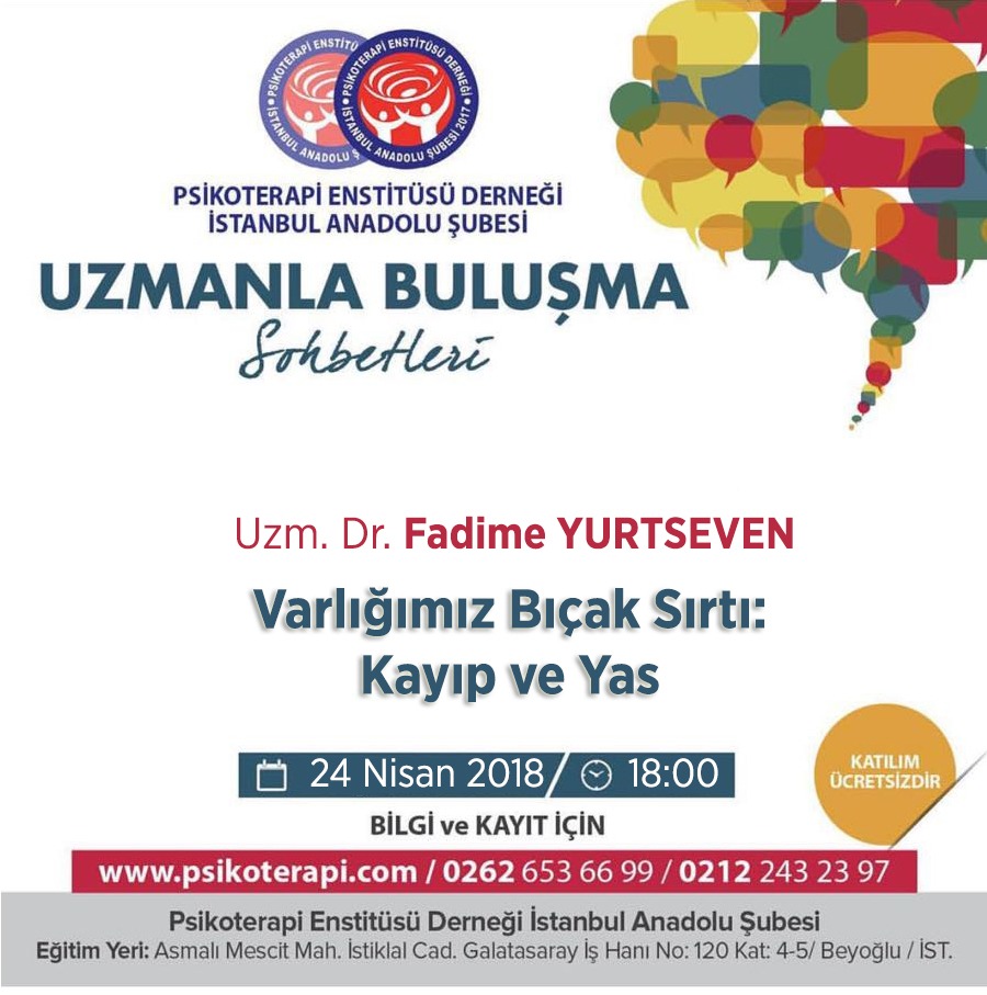 PSİKOTERAPİ ENSTİTÜSÜ DERNEĞİ İSTANBUL ANADOLU ŞUBESİ UZMANLA BULUŞMA SOHBETLERİ Uzm. Dr. Fadime Yurtseven – “Varlığımızın Bıçak Sırtı: Kayıp ve Yas” Beyoğlu 24.04.2018 Saat: 18.00 Kayıt için Tıklayınız.. Katılımcı Listesi için Tıklayınız..