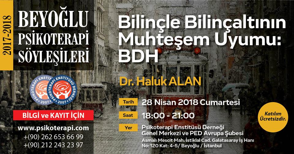 PSİKOTERAPİ ENSTİTÜSÜ DERNEĞİ GENEL MERKEZİ PSİKOTERAPİ SÖYLEŞİLERİ Dr. Haluk Alan-“Bilinçle Bilinçaltının Muhteşem Uyumu: BDH” Beyoğlu 28.04.2018 Saat: 18.00.-21.00 **”Rasgele belirleme”sonucunda Söyleşimize katılan 50 kişiye “Alerji ve Deri Hastalıklarında Hipnoterapi” kitabı hediye edilecektir. Hediye edeceğimiz kitabı alabilmeniz için ön kayıt formunu doldurmanız ve söyleşimize katılmanız gerekmektedir. Kayıt için Tıklayınız.. Katılımcı…