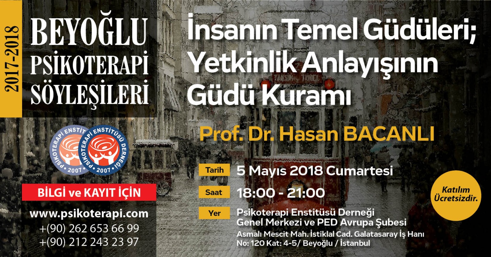 PSİKOTERAPİ ENSTİTÜSÜ DERNEĞİ GENEL MERKEZİ PSİKOTERAPİ SÖYLEŞİLERİ Prof. Dr. Hasan Bacanlı -“İnsanın Temel Güdüleri; Yetkinlik Anlayışının Güdü Kuramı” Beyoğlu 05.05.2018 Saat: 18.00-21.00 **”Rasgele belirleme”sonucunda Söyleşimize katılan 50 kişiye “Alerji ve Deri Hastalıklarında Hipnoterapi” kitabı hediye edilecektir. Hediye edeceğimiz kitabı alabilmeniz için ön kayıt formunu doldurmanız ve söyleşimize katılmanız…