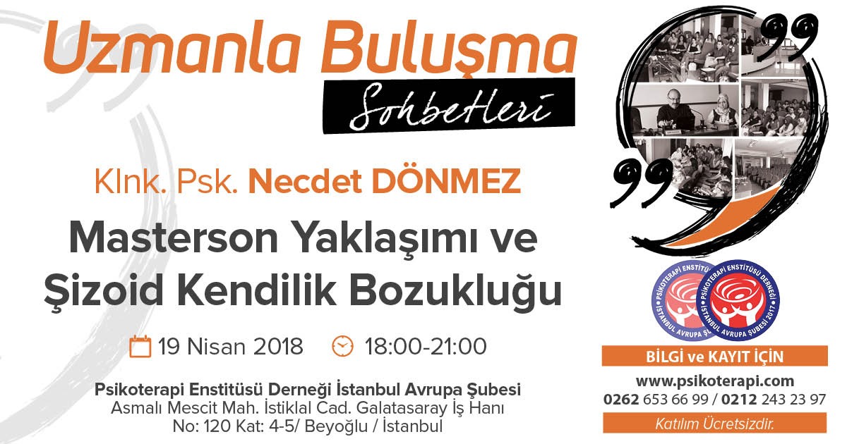 PSİKOTERAPİ ENSTİTÜSÜ DERNEĞİ İSTANBUL AVRUPA ŞUBESİ UZMANLA BULUŞMA SOHBETİ Klinik Psk. Necdet Dönmez – “Masterson Yaklaşımı ve Şizoid Kendilik Bozukluğu” Beyoğlu 19.04.2018 Saat: 18.00-21.00 Kayıt için Tıklayınız.. Katılımcı Listesi için Tıklayınız..