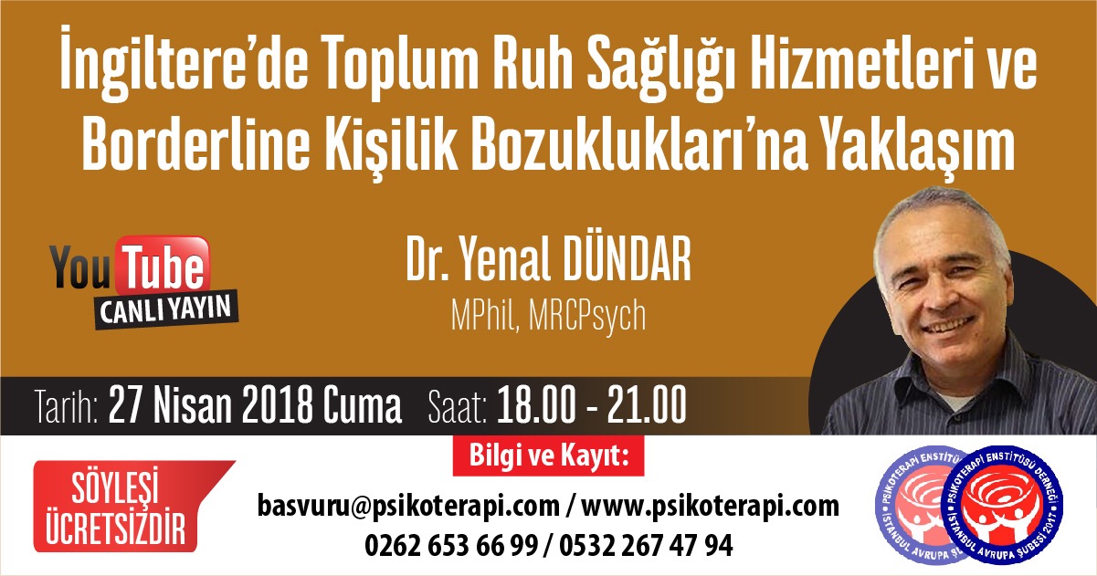 PSİKOTERAPİ ENSTİTÜSÜ DERNEĞİ GENEL MERKEZİ PSİKOTERAPİ SÖYLEŞİLERİ Dr. Yenal Dündar – “İngiltere’de Toplum Ruh Sağlığı Hizmetleri ve Borderline Kişilik Bozukluklarına Yaklaşım” Beyoğlu 27.04.2018 Saat: 18.00-21.00 , **”Rasgele belirleme”sonucunda Söyleşimize katılan 50 kişiye “Cinsel Problemlerde Hipnoterapi” kitabı hediye edilecektir. Hediye edeceğimiz kitabı alabilmeniz için ön kayıt formunu doldurmanız ve söyleşimize…