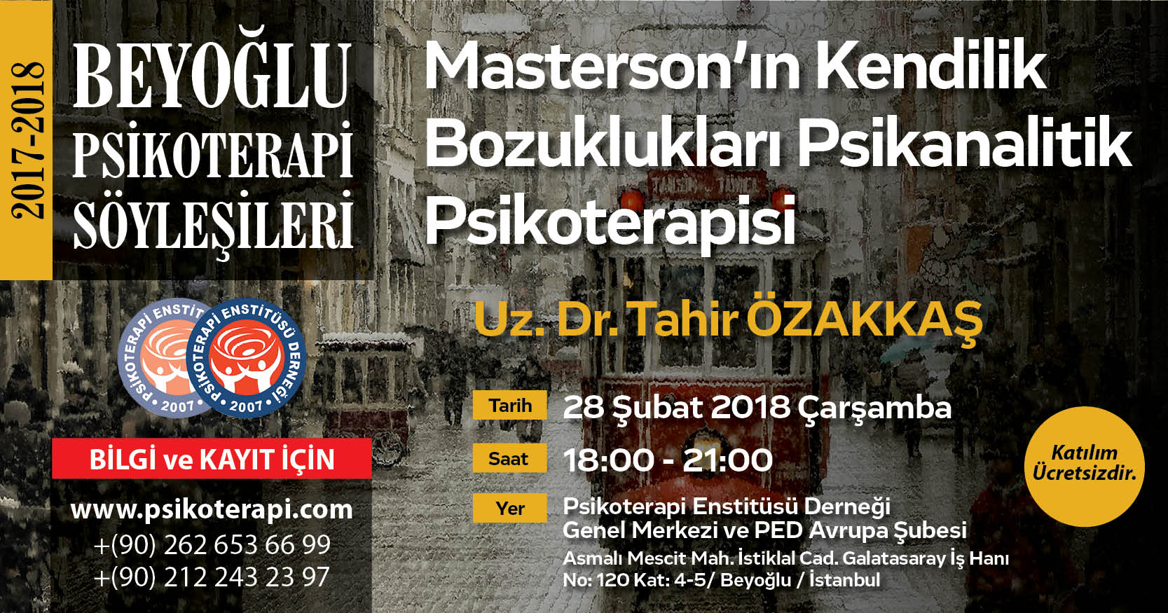 PSİKOTERAPİ ENSTİTÜSÜ DERNEĞİ GENEL MERKEZİ Uz. Dr. Tahir Özakkaş -“Masterson’ın Kendilik Bozuklukları Psikanalitik Psikoterapisi” Söyleşisi Beyoğlu 28.02.2018 Saat:18.00-21.00 **”Rasgele belirleme”sonucunda Söyleşimize katılan 50 kişiye “Gerçeğin Dirilişine Kapı: Hipnoz 2. Cilt” kitabı hediye edilecektir. Hediye edeceğimiz kitabı alabilmeniz için ön kayıt formunu doldurmanız ve söyleşimize katılmanız gerekmektedir. Kayıt için Tıklayınız.. Katılımcı Listesi…