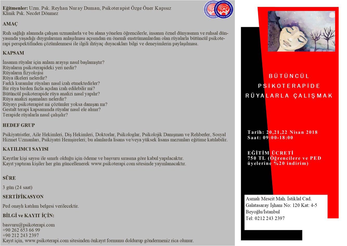 PSİKOTERAPİ ENSTİTÜSÜ DERNEĞİ İSTANBUL AVRUPA ŞUBESİ “BÜTÜNCÜL PSİKOTERAPİDE RÜYALARLA ÇALIŞMAK” Eğitmen: Uzm. Psk. Reyhan Nuray DUMAN, Psikoterapist Özge ÖNER KAPISIZ, Klinik Psk. Necdet DÖNMEZ Eğitim Tarihleri: 20,21,22 Nisan 2018 AMAÇ: Ruh sağlığı alanında çalışan uzmanlarla ve bu alana yönelen öğrencilerle, insanın öznel dünyasının ve ruhsal dünyasında yaşadığı duygularının anlaşılması açısından en önemli enstrümanlardan olan rüyalarla…
