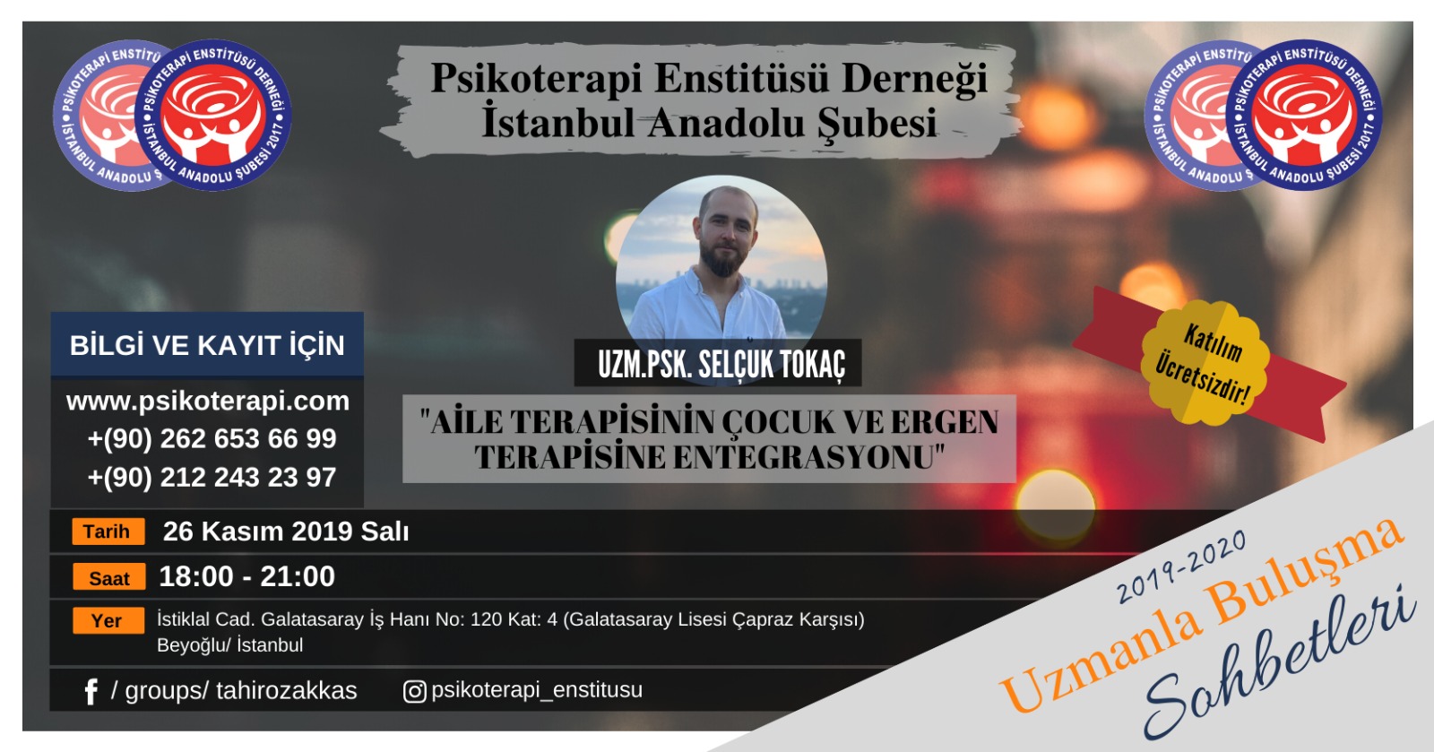 PSİKOTERAPİ ENSTİTÜSÜ DERNEĞİ İSTANBUL ANADOLU ŞUBESİ BEYOĞLU SALI PSİKOTERAPİ SÖYLEŞİLERİ Uz. Psk. Selçuk TOKAÇ-“Aile Terapisinin Çocuk Ergen Terapisine Entegrasyonu” Beyoğlu 26.11.2019 Saat: 18.00-21.00 Kayıt için Tıklayınız. Katılımcı Listesi için Tıklayınız.