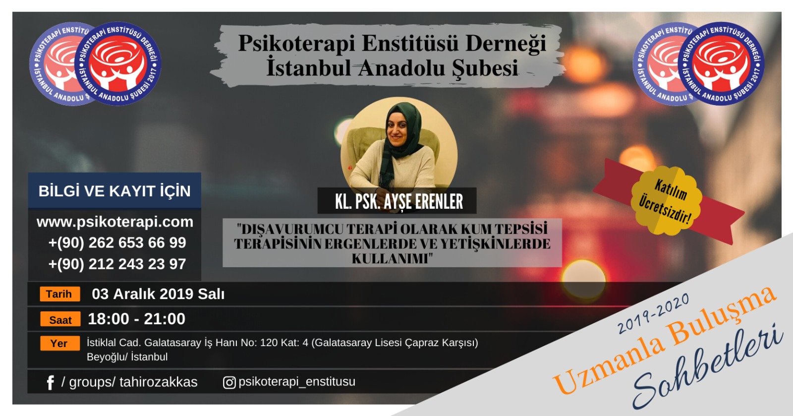 PSİKOTERAPİ ENSTİTÜSÜ DERNEĞİ İSTANBUL ANADOLU ŞUBESİ BEYOĞLU SALI PSİKOTERAPİ SÖYLEŞİLERİ Uz. Psk. Ayşe ERENLER-“Dışavurumcu Terapi Olarak Kum Tepsisi Terapisinin Ergenlerde ve Yetişkinlerde Kullanımı” Beyoğlu 03.12.2019 Saat: 18.00-21.00 Kayıt için Tıklayınız. Katılımcı Listesi için Tıklayınız.