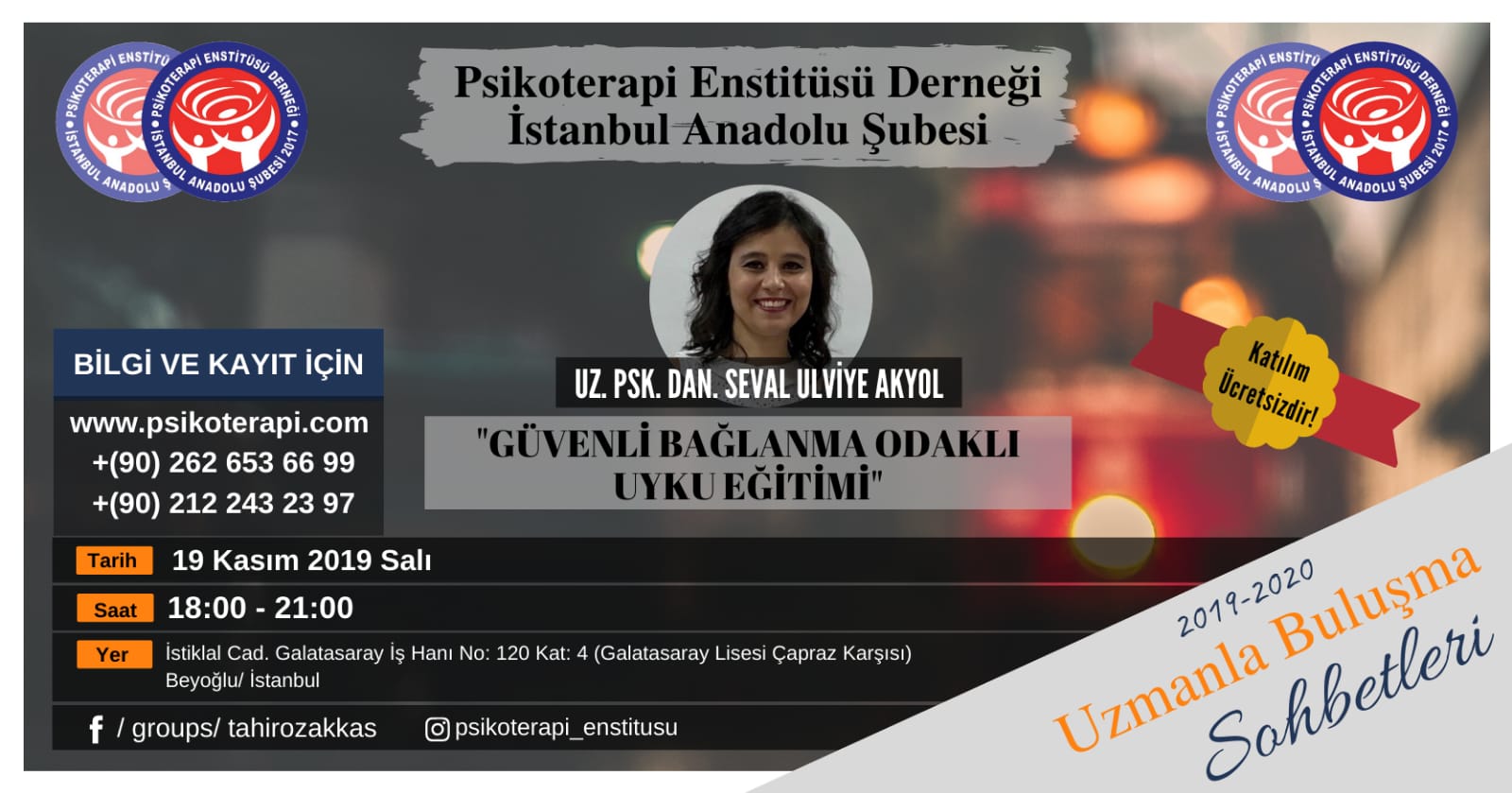 PSİKOTERAPİ ENSTİTÜSÜ DERNEĞİ İSTANBUL ANADOLU ŞUBESİ BEYOĞLU SALI PSİKOTERAPİ SÖYLEŞİSİ Uz. Psk. Dan. Seval Ulviye Akyol-“Güvenli Bağlanma Odaklı Uyku Eğitimi” Beyoğlu 19.11.2019 Saat: 18.00-21.00 Kayıt için Tıklayınız. Katılımcı Listesi için Tıklayınız.