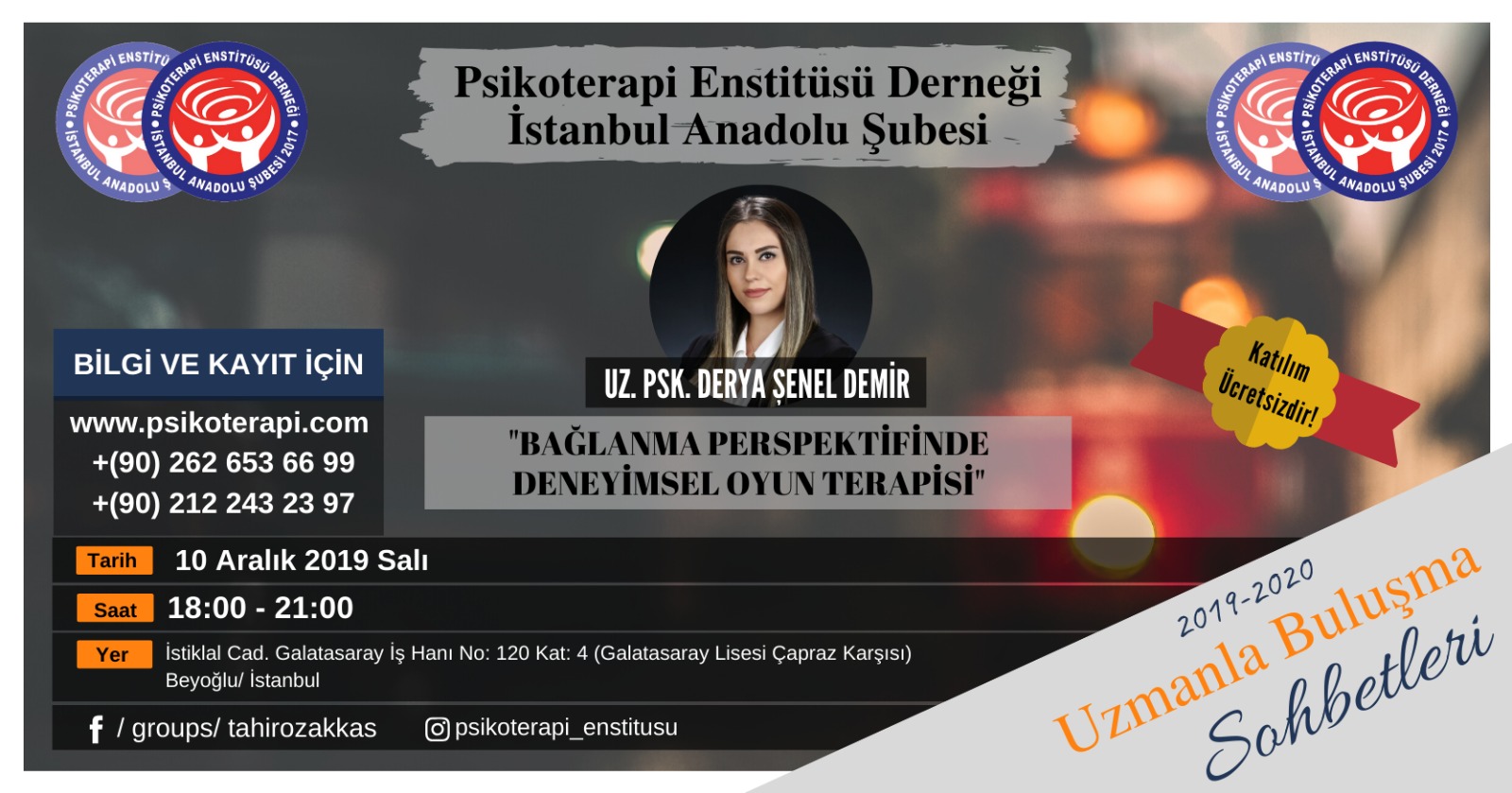 PSİKOTERAPİ ENSTİTÜSÜ DERNEĞİ İSTANBUL ANADOLU ŞUBESİ BEYOĞLU SALI PSİKOTERAPİ SÖYLEŞİSİ Uzm. Psk. Derya ŞENEL DEMİR-“Bağlanma Perspektifinde Deneyimsel Oyun Terapisi” Beyoğlu 10.12.2019 Saat: 18.00-21.00 Kayıt için Tıklayınız. Katılımcı Listesi için Tıklayınız.