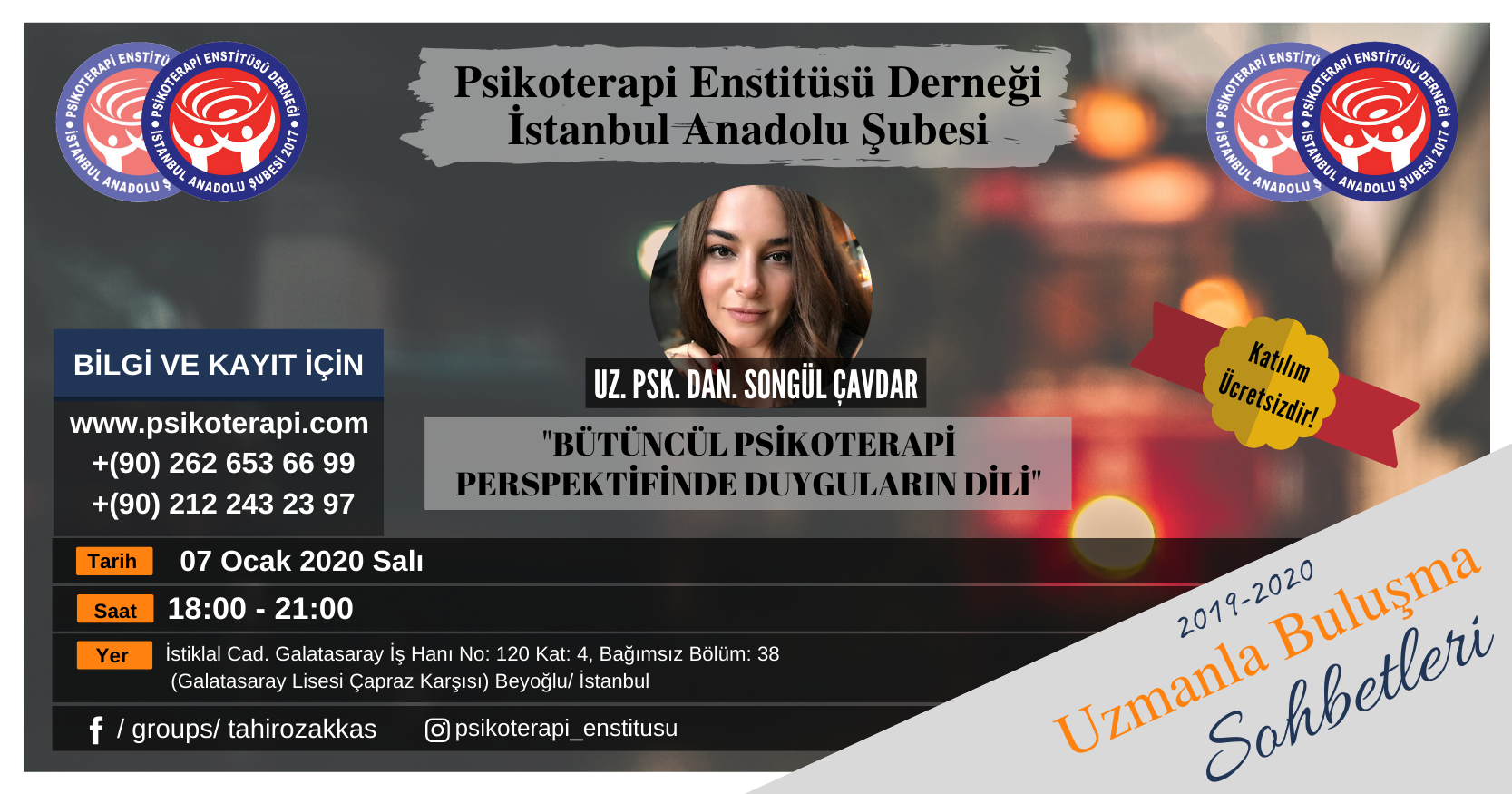 PSİKOTERAPİ ENSTİTÜSÜ DERNEĞİ İSTANBUL ANADOLU ŞUBESİ BEYOĞLU SALI PSİKOTERAPİ SÖYLEŞİLERİ Uz. Psk. Dan. Songül ÇAVDAR-“Bütüncül Psikoterapi Perspektifinde Duyguların Dili” Beyoğlu 07.01.2020 Saat: 18.00-21.00 Kayıt için Tıklayınız. Katılımcı Listesi için Tıklayınız.